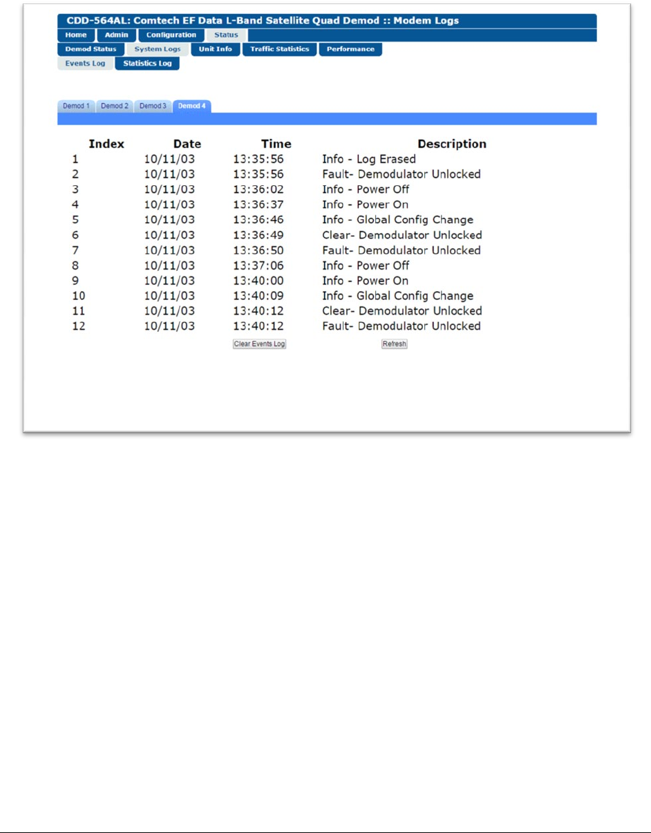 Use this page to see the log of system Events for a selected demodulator. You can clear the Events Log