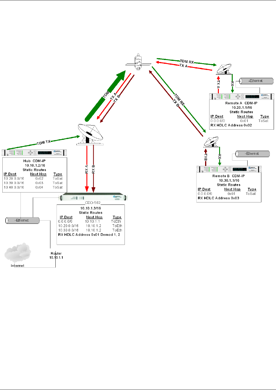 transmitting a common TDM carrier to two remote sites with CDM-IP modems. In turn, the Remote